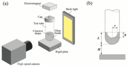 本研究では、ガラスビーズを用いた粉体層に凹面形状の穴を形成し,下から衝撃を与え、その後に生じる粉体ジェットの挙動を高速カメラで撮影、解析することで、湿度による粉体の付着力変化を定量化しました。粉体層を密閉した試験管を自由落下させ、下部の金属板に衝突させて衝撃を与えるシンプルな構成を採用しました(図1)。このとき生じるジェットの高さ・速度を、湿度条件(60〜90%RH)ごとに比較しました。