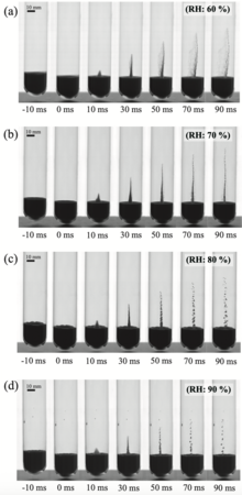 図2 落下前後における粉体ジェットの形成される様子。湿度が高くなると、ジェットの高さが低くなる様子が見られた。
