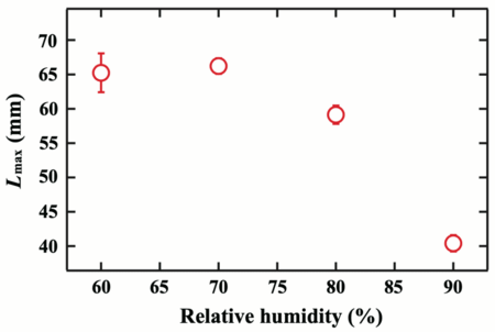 図3 ジェットの最大高さと湿度の関係。湿度70%以上となり、湿度による相互作用が強くなると、ジェットの高さが低くなる。ジェットの高さから粉体が充分に乾燥しているかわかる。