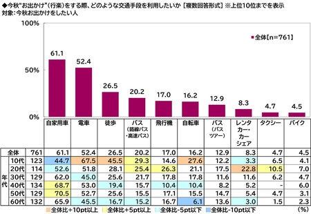 今秋のお出かけで利用したい交通手段 1位「自家用車」2位「電車」
