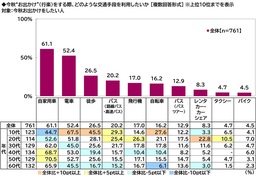 年代別にみると、10代では「電車」(67.5%)、「徒歩」(45.5%)、「自転車」(27.6%)、20代では「レンタカー・カーシェア」(22.8%)が、全体と比べて10ポイント以上高くなりました。