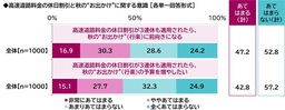 【高速道路料金の休日割引が3連休も適用されたら、秋の“お出かけ”(行楽)の予算を増やしたい】では、『あてはまる(計)』は42.8%、『あてはまらない(計)』は57.2%でした。