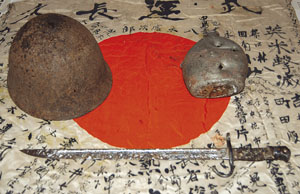 ガダルカナル島展に出品された、現地収集品(平成15年11月24日撮影)。ガダルカナル島は「餓島」と呼ばれ、後方支援のないまま多くの本県出身兵士が餓死したという